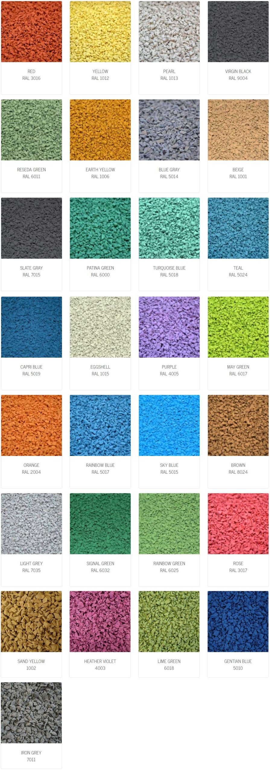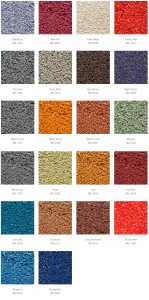 Warstwa EPDM nawierzchni bezpiecznej może być wykonana w wersji jednobarwnej lub w różnych konfiguracjach połączeń kolorystycznych (wielokolorowe oraz melanże kolorystyczne).